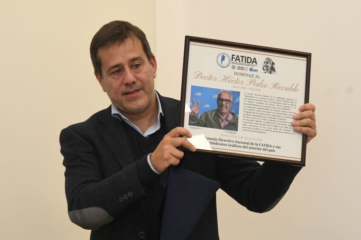 Antes del cierre de la jornada, el CDN –en la persona del compañero Héctor Schmidt–, junto al compañero Enrique Marano, le entregaron a Mariano Recalde una plaqueta de homenaje as su padre, el Dr. Héctor Pedro Recalde, fallecido el año pasado, con el siguiente texto: “El Consejo Directivo Nacional de la Federación Argentina de Trabajadores de la Imprenta, Diarios y Afines (FATIDA) rinde su más sentido homenaje y eterno reconocimiento a quien en vida fue un referente ineludible del derecho laboral argentino y un incansable defensor de los derechos de las y los trabajadores. Su compromiso inquebrantable con la justicia social, su vocación por el derecho colectivo del trabajo y su constante labor a favor de la dignidad del movimiento obrero organizado, lo convirtieron en una figura indispensable para el sindicalismo argentino. Eminente asesor de la FATIDA, saludamos con profundo respeto a este destacado legislador en defensa de la clase obrera argentina. Transmitimos nuestra gratitud por su legado y por haber sido un aliado permanente de las causas justas del trabajador. Su trayectoria, su palabra y su coherencia quedarán por siempre en la memoria del pueblo argentino. 28/05/1938 – 9/12/2024 28/05/1938 – 9/12/2024 Consejo Directivo Nacional de la FATIDA y sus filiales”.