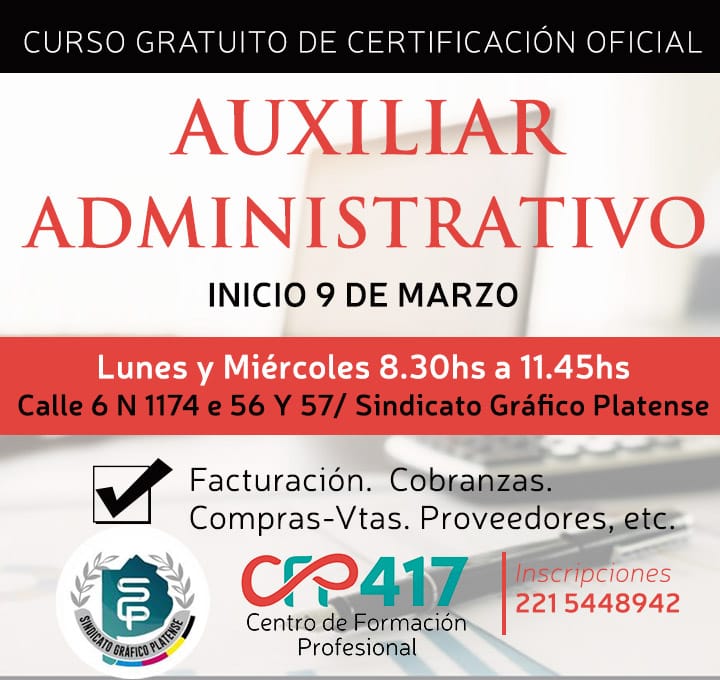 Como ya habíamos adelantado, comenzamos a dictar cursos de formación en nuestra sede gremial. El próximo lunes arrancan los dos primeros: “Auxiliar Administrativo” y “Asistente Jurídico y Notarial” ambos con Certificación Oficial de los Ministerios de Educación y Trabajo de provincia.
